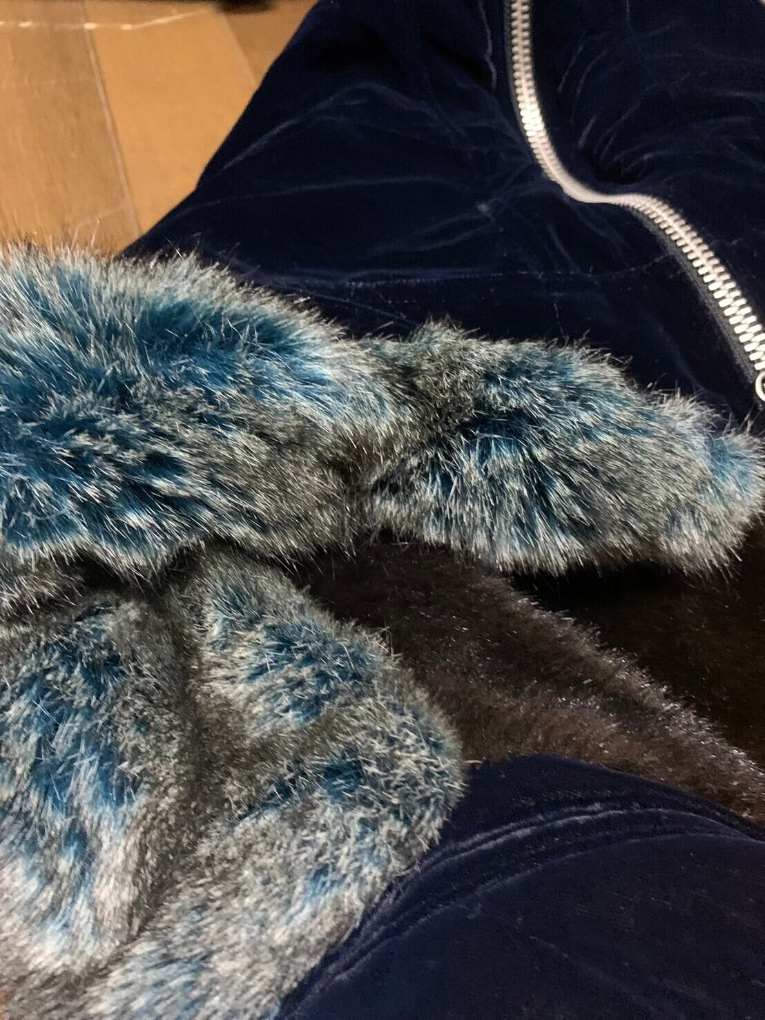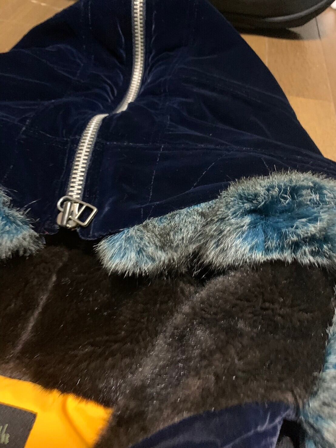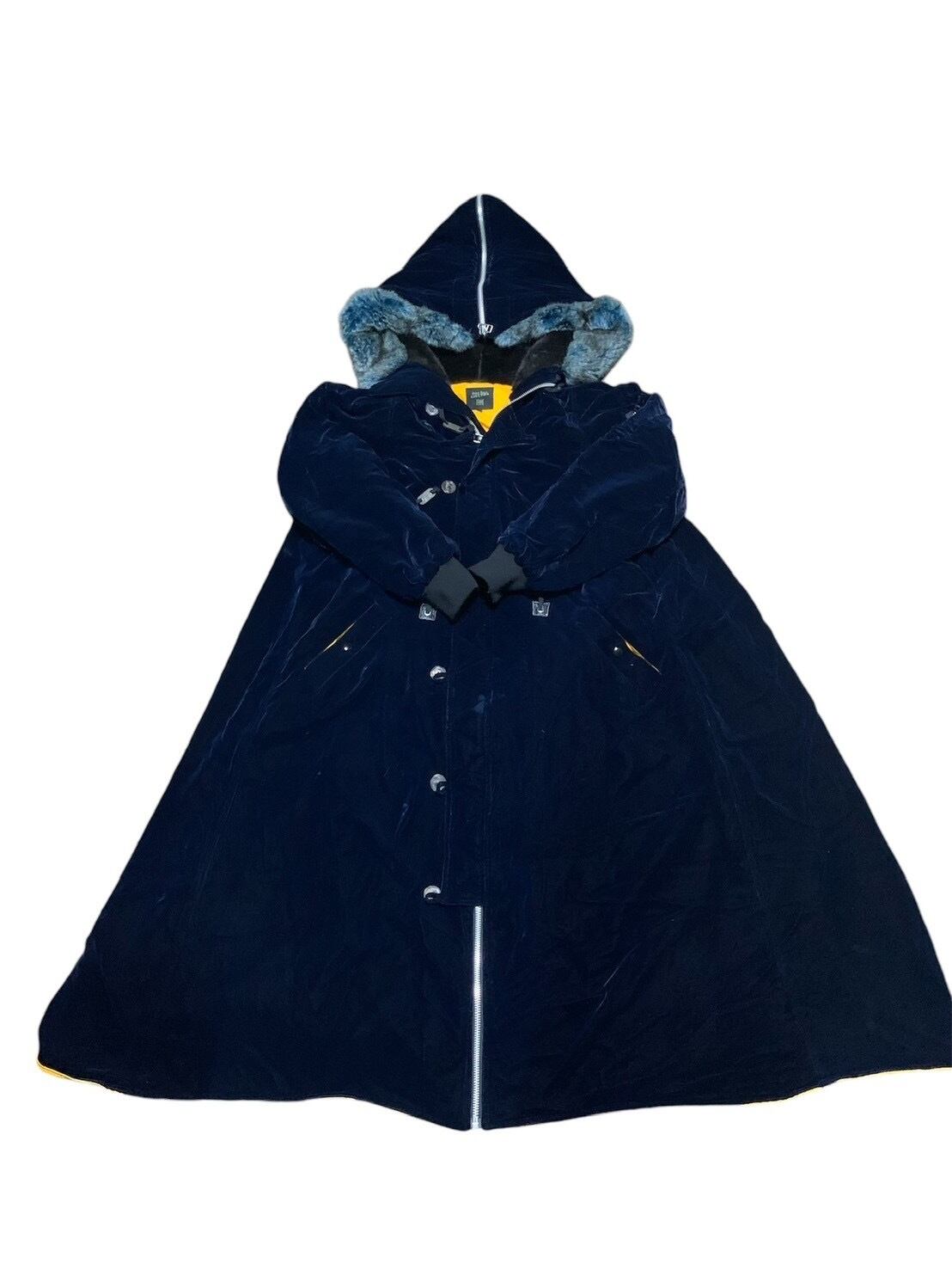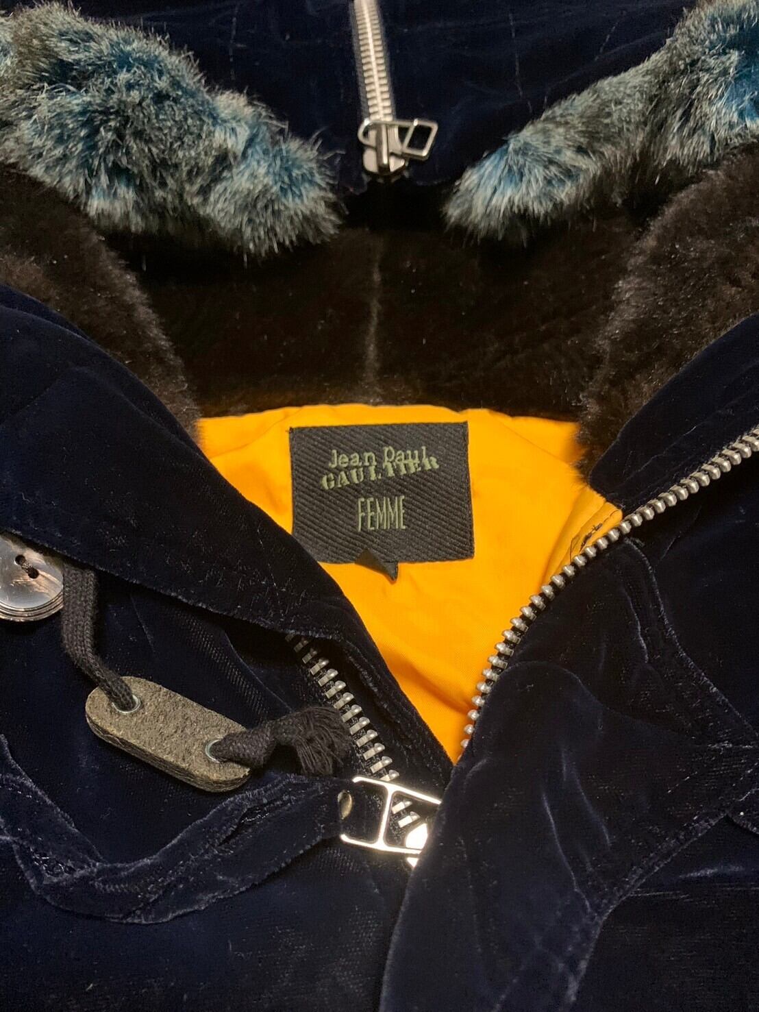 ゴルチエのベロア生地のスーパーロングコートです。細部にさまざまなギミックがあり裏地はキルティング。これからの時期に大活躍です。フードはジップがついており気分によってシルエットを変えることができます。紺色に黄色の裏地がよく映えます。是非。